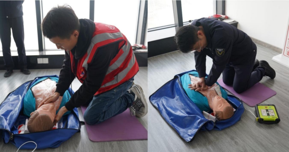 本次培訓分為理論講解及現(xiàn)場實操,理論講解涵蓋突發(fā)事件急救常識、急救程序等知識和技能,現(xiàn)場實操由紅十字會救援老師親自示范心肺復蘇及AED救護流程?!坝米笫终聘o貼病人的胸部,兩手重疊,左手五指翹起,雙臂深直,用上身力量用力按壓30次,按壓深度至少5CM,按壓頻率至少100次每分鐘” 紅十字會救援老師一邊演示,一邊強調重點,用生動直觀的方式,幫助參訓員工快速掌握急救要領和技巧。
